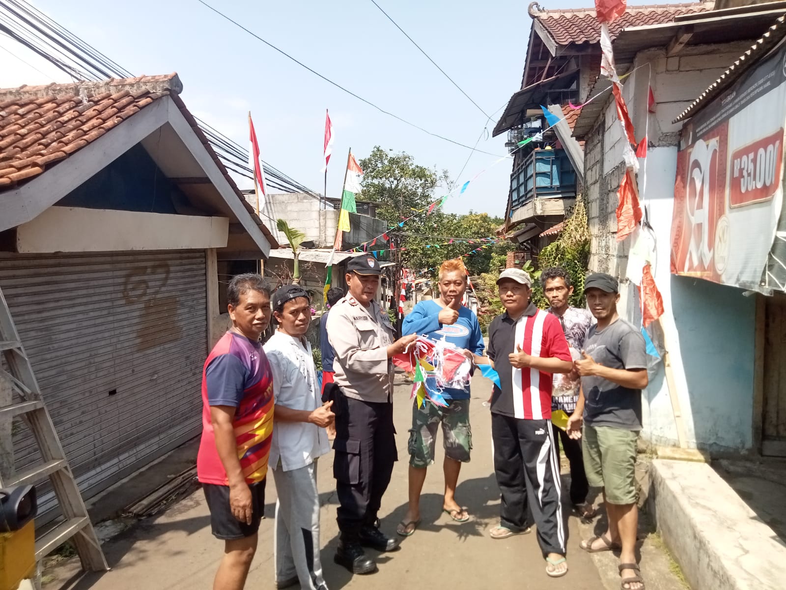 Selain membagikan, Aiptu Wahyudi juga turut membantu warga memasang bendera dan umbul-umbul di sekitar lingkungan. Hal ini menjadi bentuk nyata motivasi kepada masyarakat untuk memeriahkan peringatan HUT RI ke-80 dengan penuh semangat, sekaligus menumbuhkan rasa cinta tanah air dan bangsa.