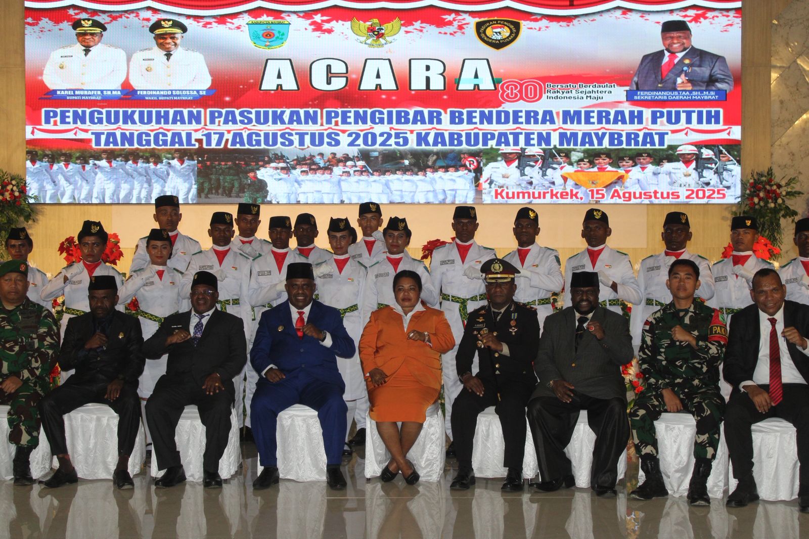 KUMURKEK, BUSERJATIM.COM GROUP – Sebanyak 32 Pasukan Pengibar Bendera Pusaka (Paskibraka) Kabupaten Maybrat resmi dikukuhkan dalam sebuah upacara yang penuh khidmat dan sarat makna di Gedung Aula Samusiret, Jumat (15/08/25).