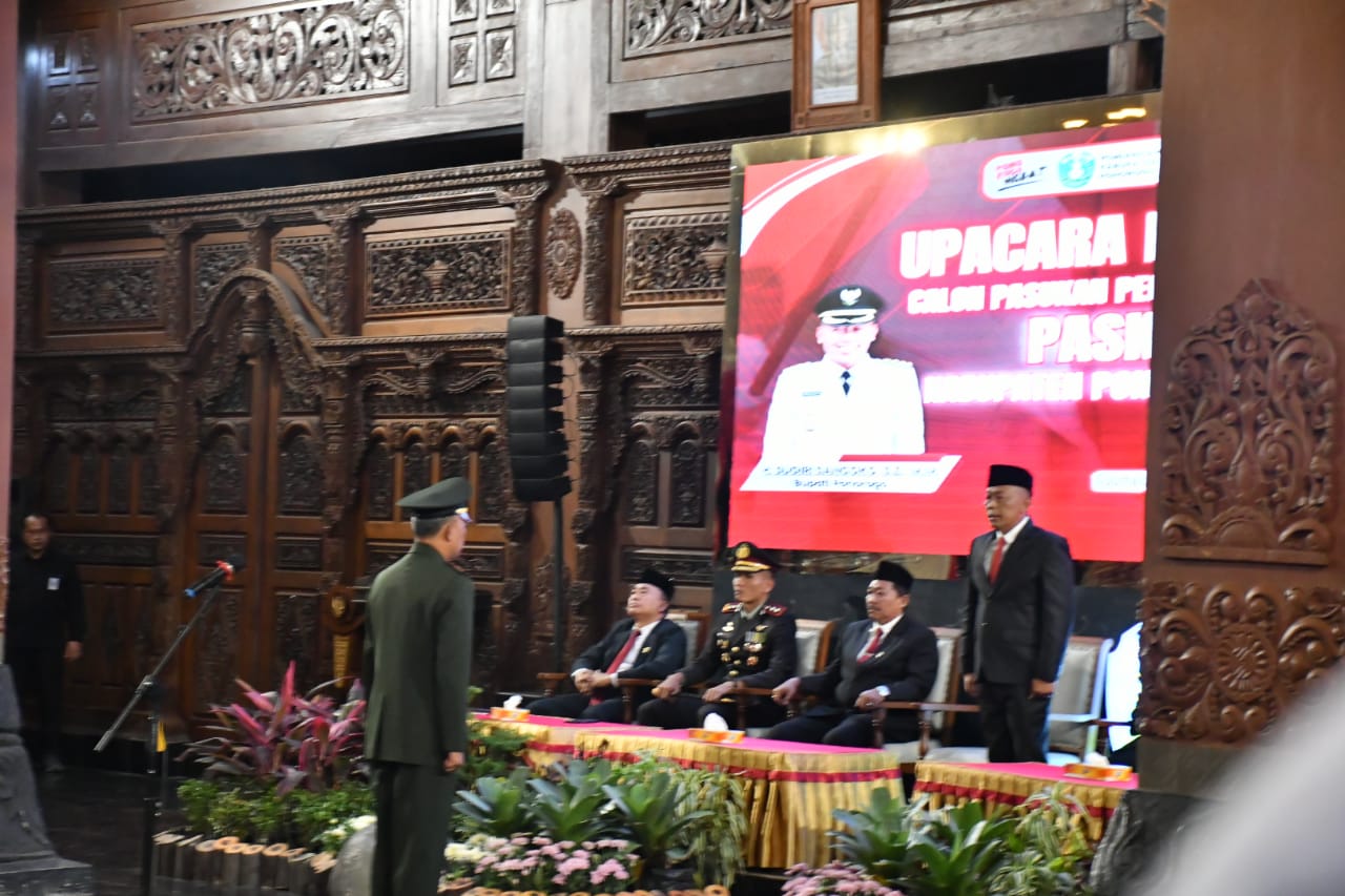 PONOROGO,BUSERJATIM.COM GROUP,-Komandan Kodim 0802/Ponorogo Letkol Inf Dwi Soerjono tadi malam (Jumat, 15/08) menghadiri Upacara Pengukuhan Pasukan Pengibar Bendera Pusaka (Paskibraka) Kabupaten Ponorogo tahun 2025 bertempat di Pendopo Agung Kabupaten Ponorogo, Sabtu (16/08/2025).