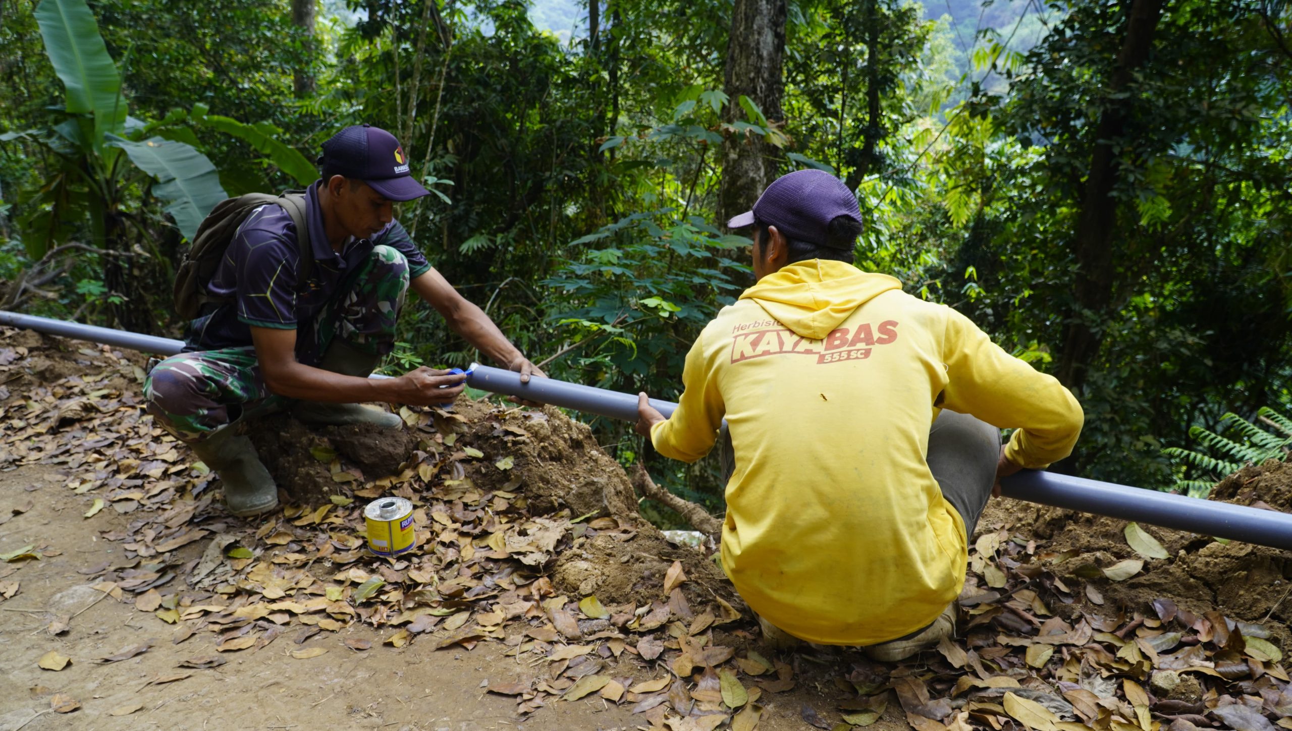 Sejak fajar, para prajurit bersama masyarakat bergotong royong. Suara cangkul, denting palu, dan tawa ringan menyatu dalam irama kerja yang tak kenal lelah. Satu per satu, pipa-pipa dipasang, mengular mengikuti lekuk jalan desa yang baru di buka, seakan menjadi urat nadi yang siap memompa kehidupan.