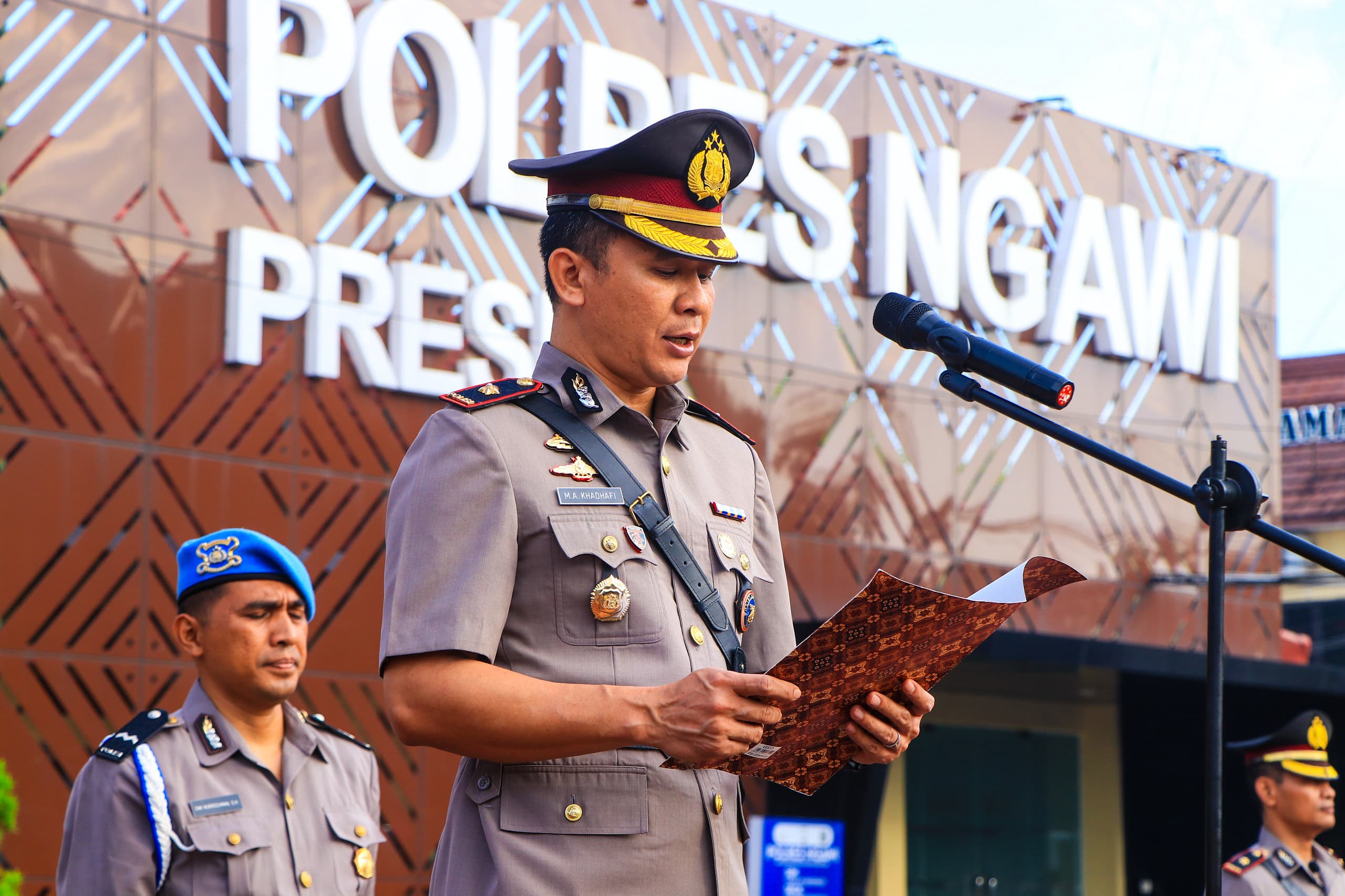 Bertindak selaku Inspektur Upacara, Wakapolres Ngawi Kompol Moh. Asrori Khadhafi, S.H., mewakili Kapolres Ngawi AKBP Charles Pandapotan Tampubolon, S.I.K., S.H., M.H., yang mengikuti kegiatan serupa di Surabaya.