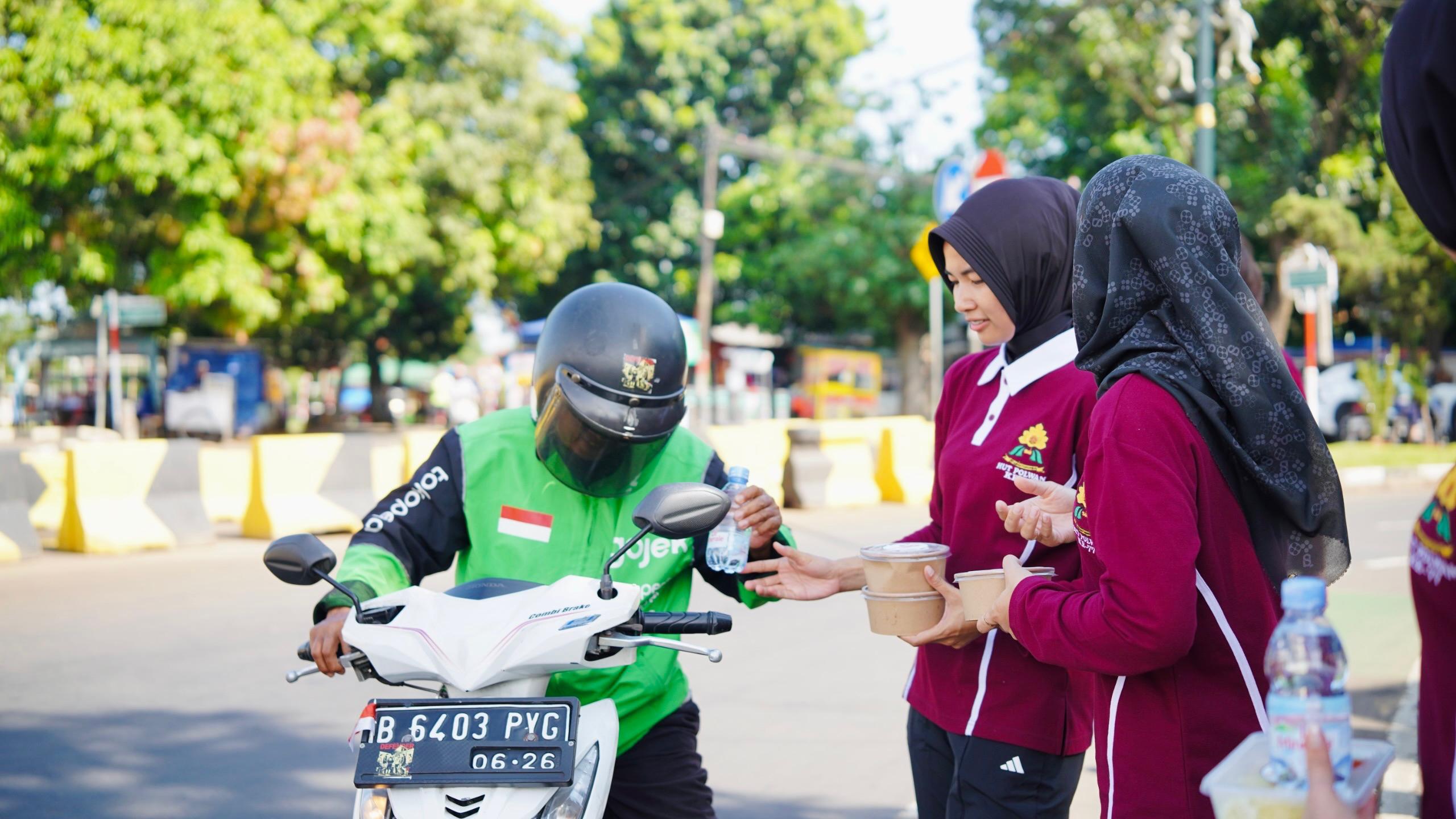 Dengan penuh kepedulian, para Polwan membagikan paket nasi kotak dan air mineral kepada pengguna jalan, pengemudi ojek online, serta masyarakat yang melintas di kawasan tersebut.