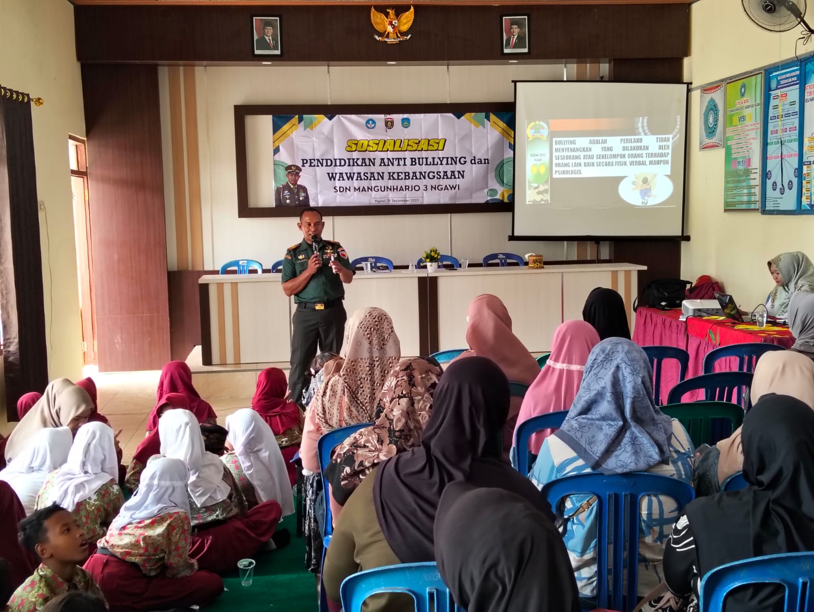 NGAWI, BUSERJATIM.COM GROUP – Upaya menanamkan jiwa nasionalisme dan karakter positif sejak dini terus digencarkan jajaran TNI melalui kegiatan pembinaan teritorial. Salah satunya dilakukan oleh Danramil 0805/01 Ngawi Kapten Czi Nur Volasohi yang menggelar sosialisasi anti-bullying dan wawasan kebangsaan di SDN Mangunharjo 3, Ngawi, pada Rabu (10/09/2025).
