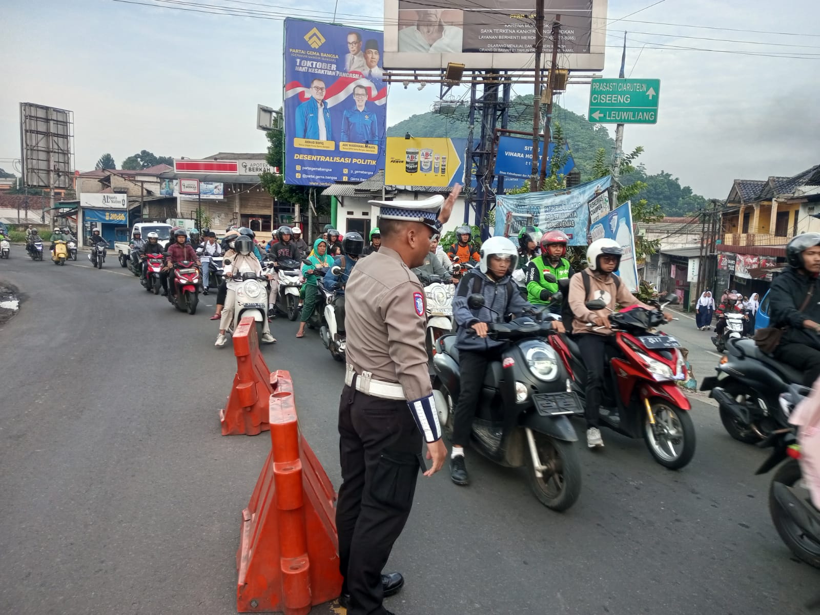 Anggota lalu lintas Polsek Ciampea terlihat sigap membantu pengguna jalan di titik-titik yang rawan terjadi kepadatan kendaraan. Selain melakukan pengaturan arus lalu lintas, petugas juga turut mengatur pejalan kaki, khususnya anak-anak sekolah yang menyeberang jalan di lokasi yang ramai kendaraan.