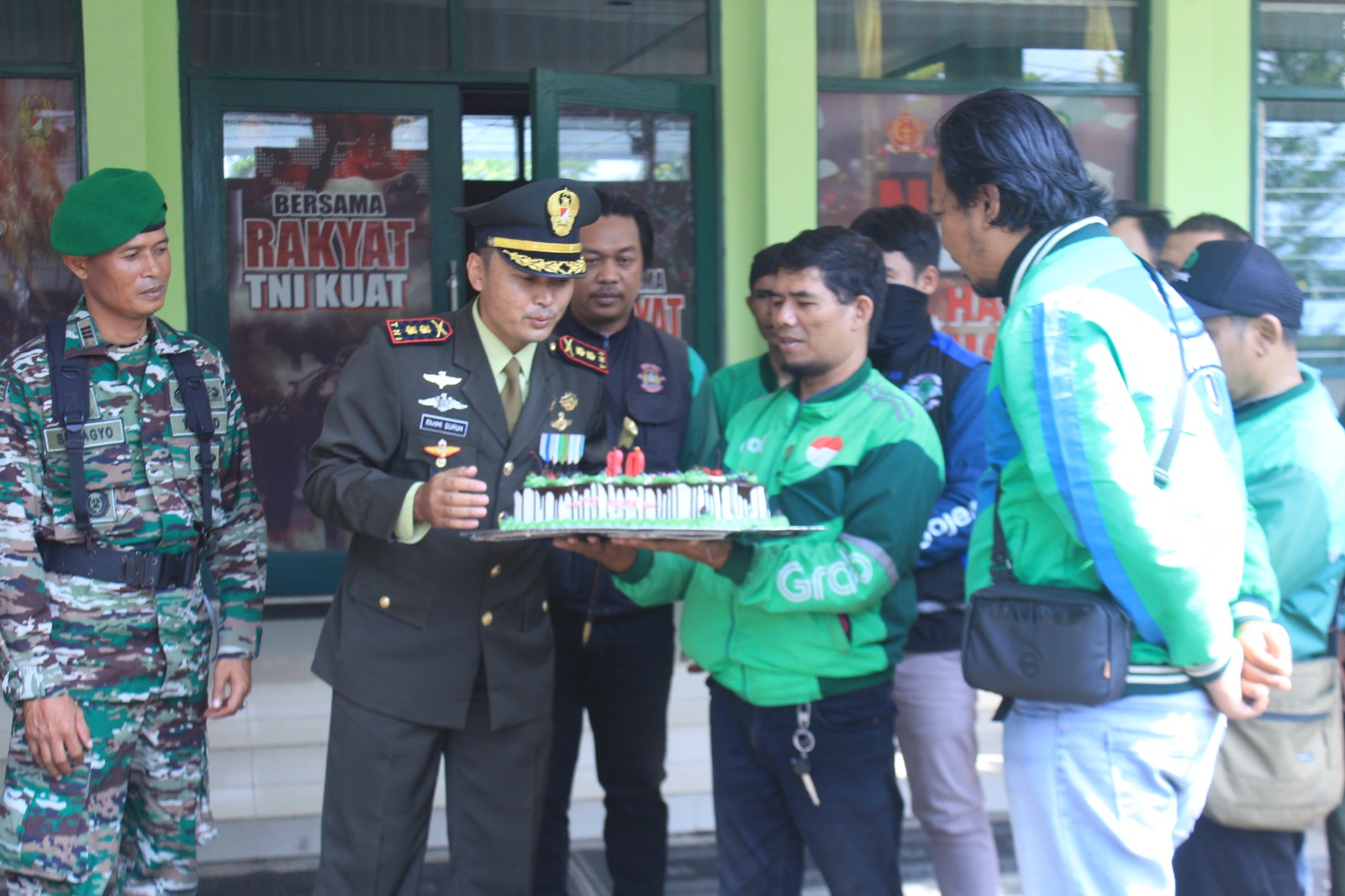 Sebagai simbol penghormatan, para driver ojol menyerahkan tart HUT TNI ke-80 kepada Dandim. Momen ini juga dilanjutkan dengan sesi foto bersama serta ramah tamah, di mana kedua pihak saling berbagi cerita dan semangat kebersamaan.