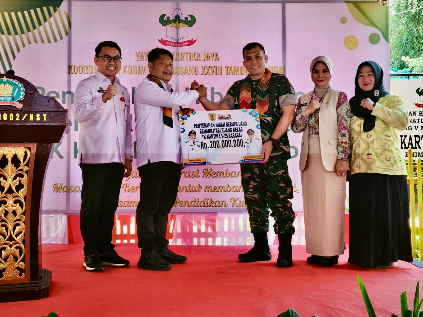 BARABAI, BUSERJATIM.COM GROUP – Dengan semangat “Bersama TNI, Pendidikan Kuat”, Pemerintah Kabupaten Hulu Sungai Tengah (HST) menyerahkan hibah dana rehabilitasi bangunan TK Kartika V-25 Barabai kepada Yayasan Kartika Jaya Koordinator Kodim 1002 Cabang XXVIII Tambun Bungai, Rabu (8/10/2025) di halaman sekolah TK Kartika, Jalan Bima, Kelurahan Barabai Selatan, Kecamatan Barabai.