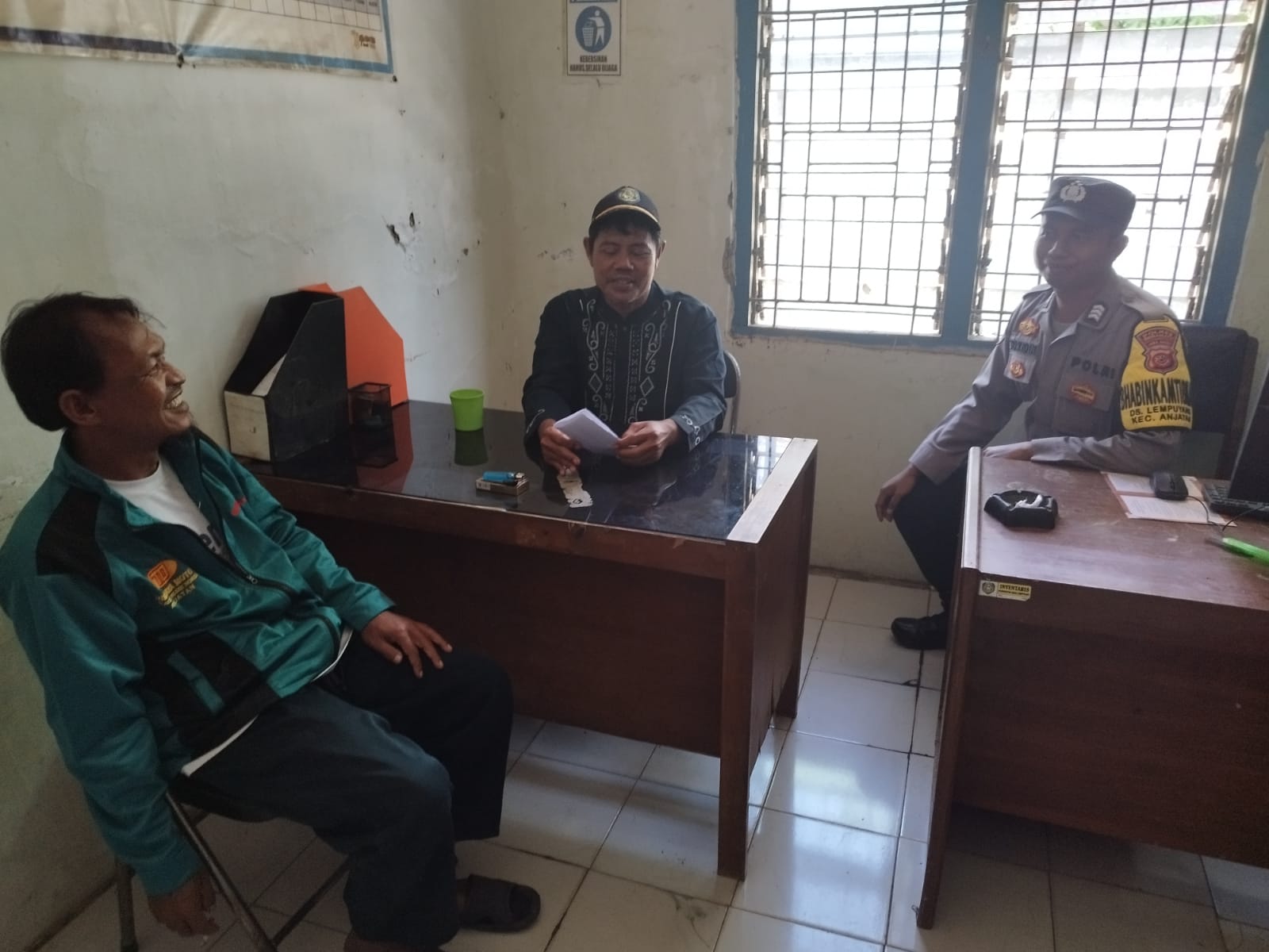 Dua personel Polsek Anjatan tampak berdialog akrab dengan perangkat desa, sebagai bagian dari kegiatan sambang dan silaturahmi dalam rangka mempererat sinergitas antara Polri dan pemerintah desa.