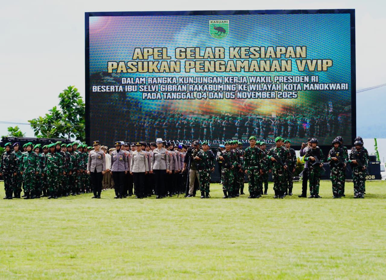 MANOKWARI, BUSERJATIM.COM GROUP  (4/11/25) – Persiapan pengamanan VVIP bergerak cepat di Kota Manokwari menjelang kunjungan kerja Wakil Presiden Republik Indonesia, Gibran Rakabuming Raka, B.Sc., bersama Ibu Selvi Gibran Rakabuming Raka. Kesiapan tersebut diwujudkan melalui Apel Gelar Pasukan Pengamanan VVIP yang dipimpin langsung oleh Pangdam XVIII/Kasuari, Mayjen TNI Christian Kurnianto Tehuteru, bertempat di Lapangan Makodam XVIII/Kasuari, Manokwari, Papua Barat, Senin (3/11).