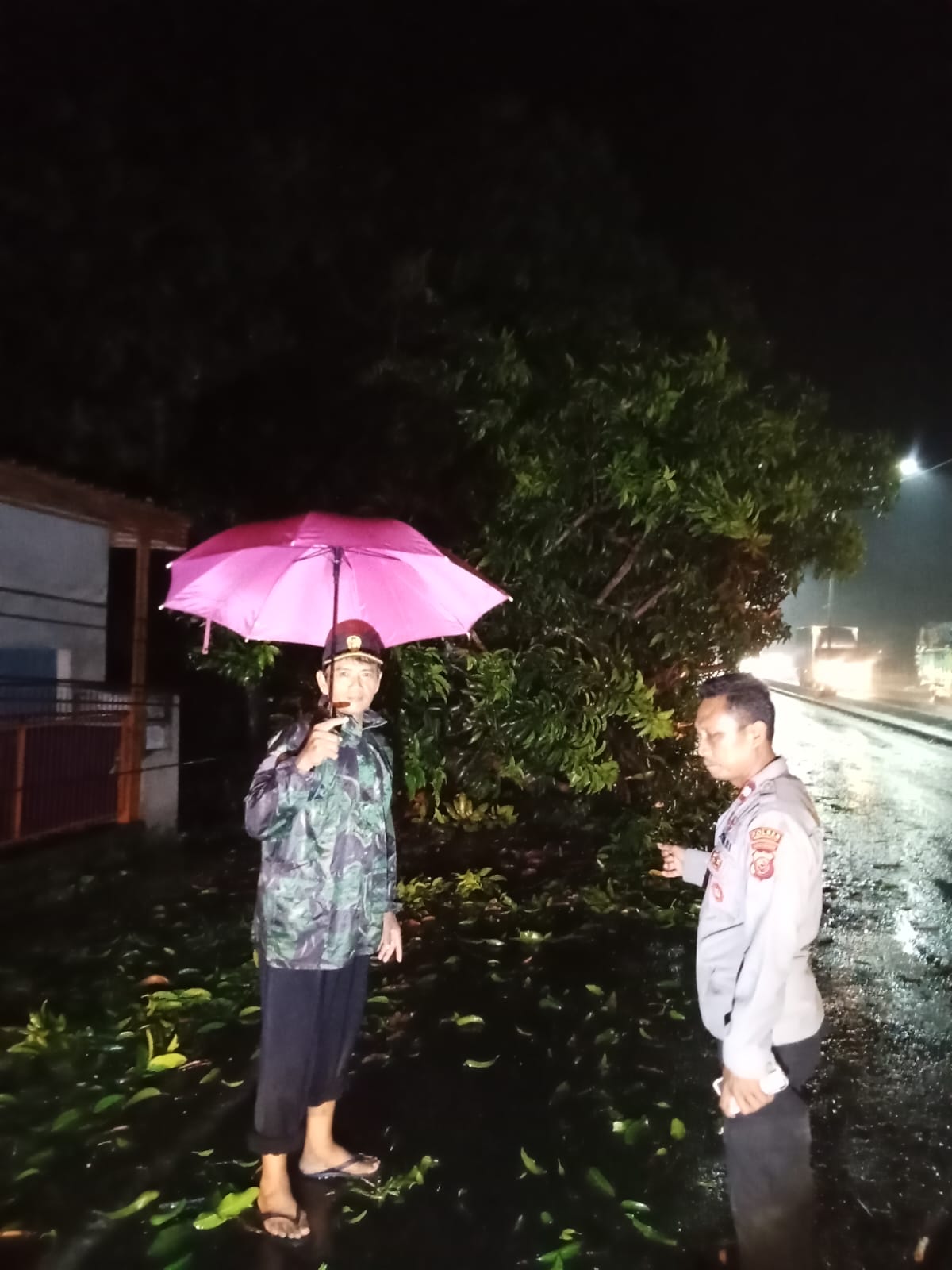 Dengan menggunakan senter dan jas hujan, mereka melakukan pengaturan lalu lintas agar kendaraan yang melintas tetap aman, sembari berkoordinasi dengan warga untuk mengevakuasi pohon yang melintang di jalan.