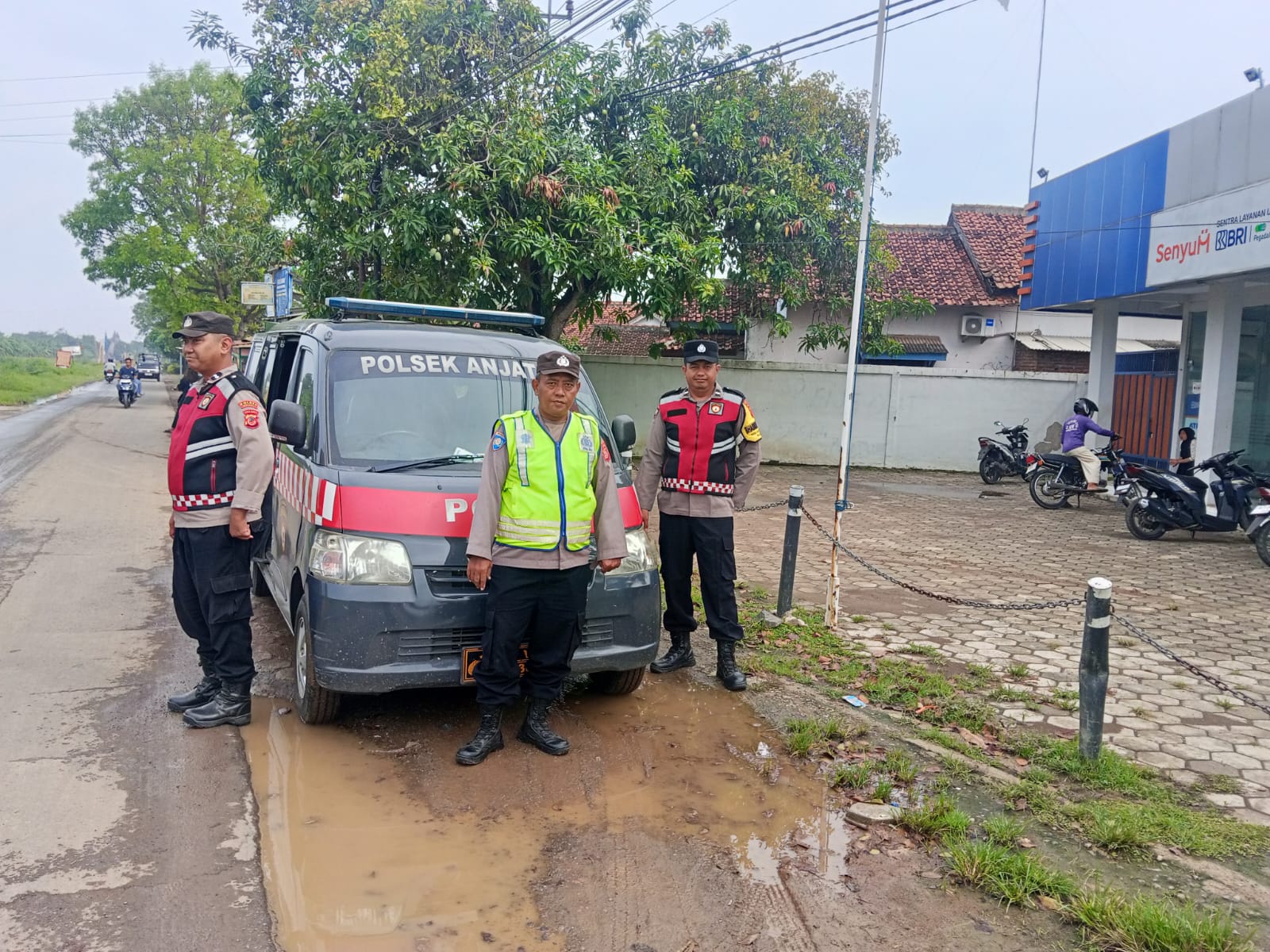 Personel Polsek Anjatan tampak menyambangi berbagai lokasi publik, mulai dari minimarket hingga bank, untuk memastikan situasi tetap kondusif.