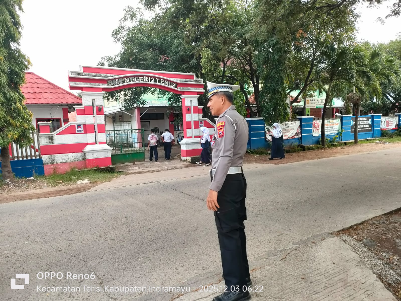 Kanit Lantas diterjunkan untuk melakukan pengaturan arus kendaraan di depan SMPN 1 Terisi, salah satu lokasi dengan mobilitas masyarakat yang cukup tinggi pada jam sibuk.