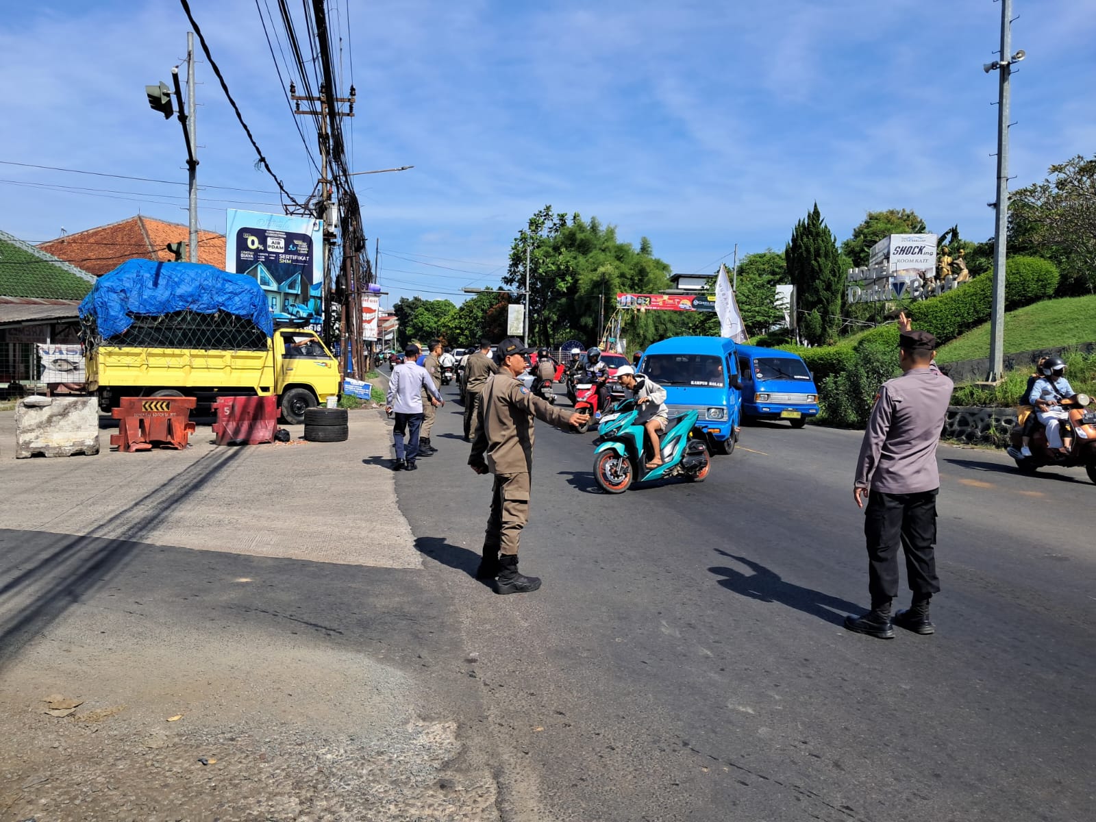 Bhabinkamtibmas dibantu dari Dishub dan Satpol PP Kecamatan Dramaga melaksanakan Pengaturan lalu lintas ini upaya preventif untuk menciptakan kamseltibcarlantas di simpang JLD Duta Berlian, tambah Kapolsek IPTU Desi Triana.,S.H.,M.H.