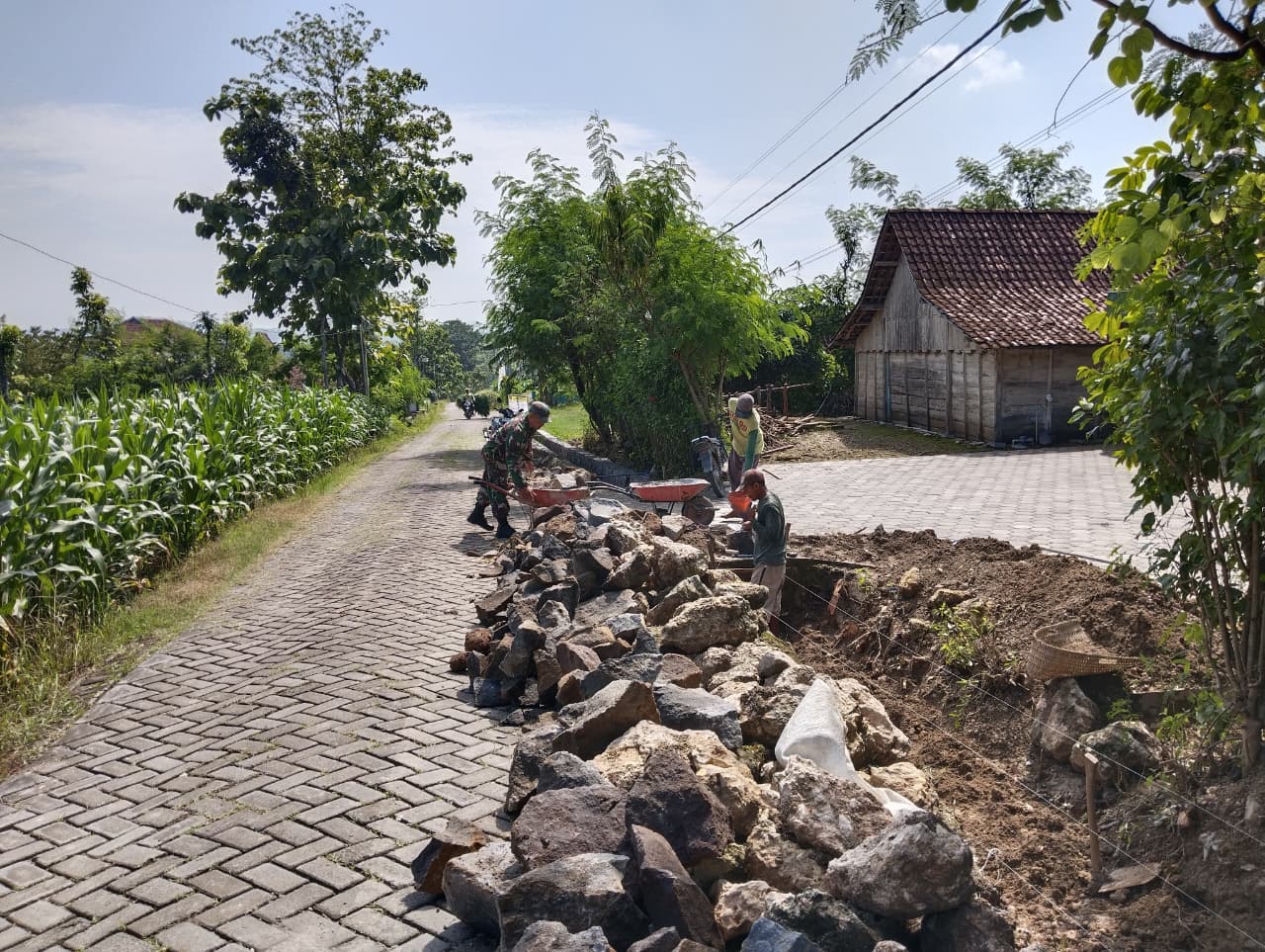 Di lokasi pembangunan, tampak Babinsa bersama sejumlah warga, melaksanakan pembangunan drainase.