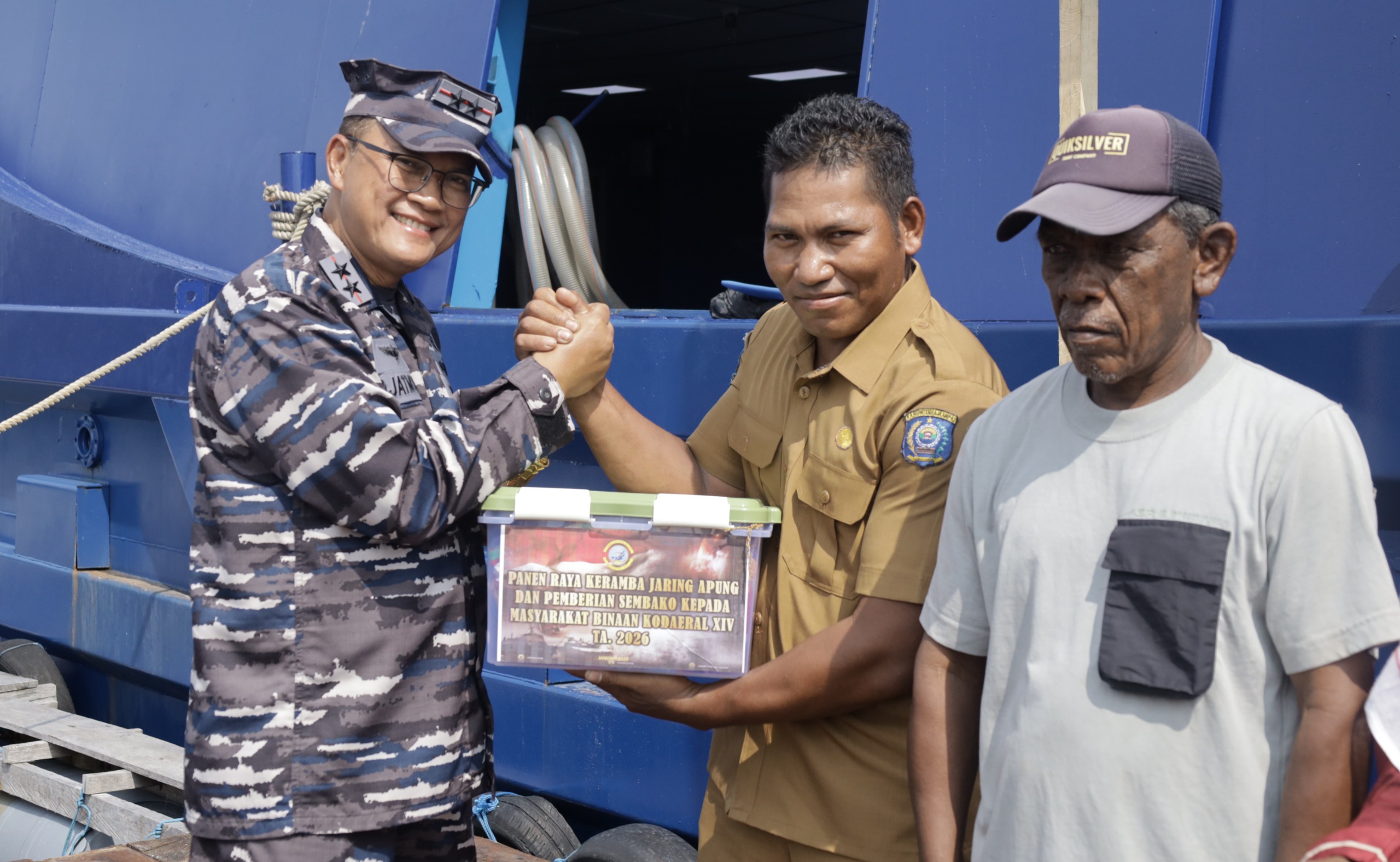 yang tangguh, produktif, sehat, dan berdaya saing, Komandan Komando Daerah TNI Angkatan Laut XIV (Komandan Kodaeral XIV), Laksamana Muda TNI Djatmoko, S.T., M.M., CHRMP, melaksanakan kegiatan panen raya keramba jaring apung dan pemberian sembako kepada masyarakat binaan Kodaeral XIV. bertempat di Kampung Bianci, Distrik Waigeo Barat, Kabupaten Raja Ampat Provinsi Papua Barat Daya, Kamis (29/01/2026).