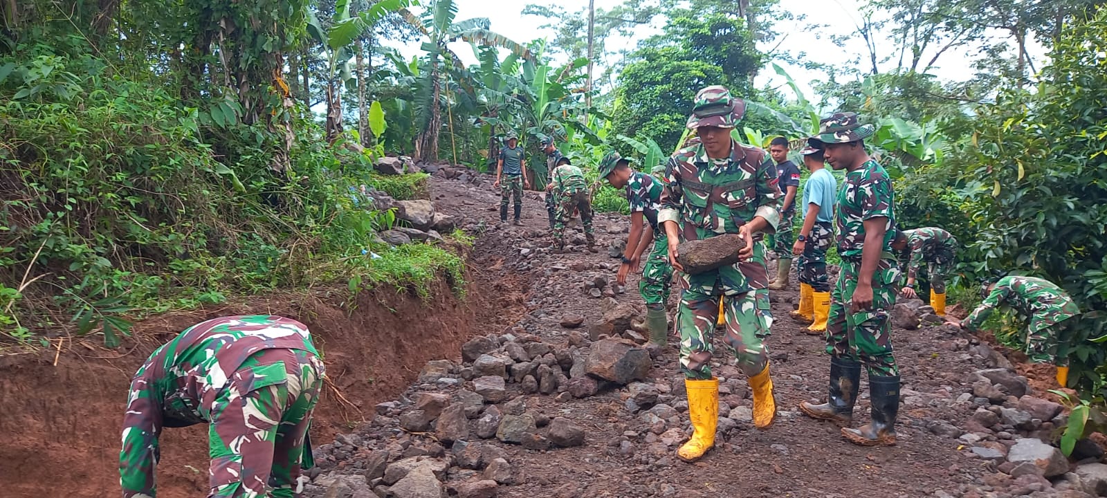 Semangat gotong royong tampak jelas dalam setiap tahapan pekerjaan. Personel TNI bersama masyarakat bahu-membahu menyelesaikan pengerjaan jalan agar dapat segera dimanfaatkan oleh warga.