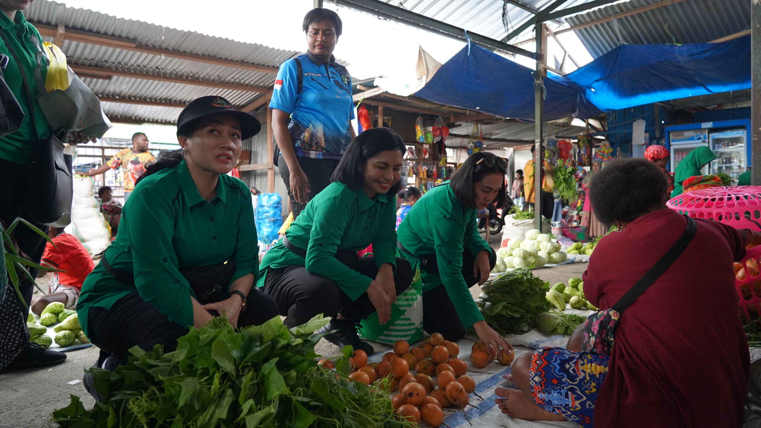 Suasana penuh tawa dan kehangatan mewarnai setiap interaksi, saat para Mama Papua berbagi cerita tentang perjuangan mereka berdagang. Momentum ini menjadi ruang saling menguatkan antara Persit dan masyarakat, sekaligus memperlihatkan bahwa kepedulian sederhana dapat membawa dampak besar bagi kesejahteraan bersama.