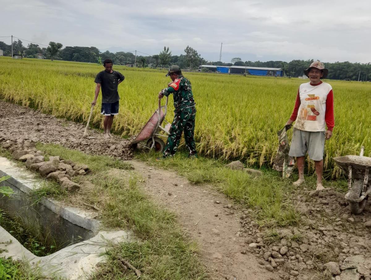 Seperti hari ini dilakukan Serda Yusuf H anggota Koramil Tipe B 0802/15 Mlarak, Kodim 0802/Ponorogo yang melaksanakan kegiatan Binter di wilayah desa binaan berupa membantu warga yang sedang bergotong royong memperbaiki jalan rusak di area persawahan warga.