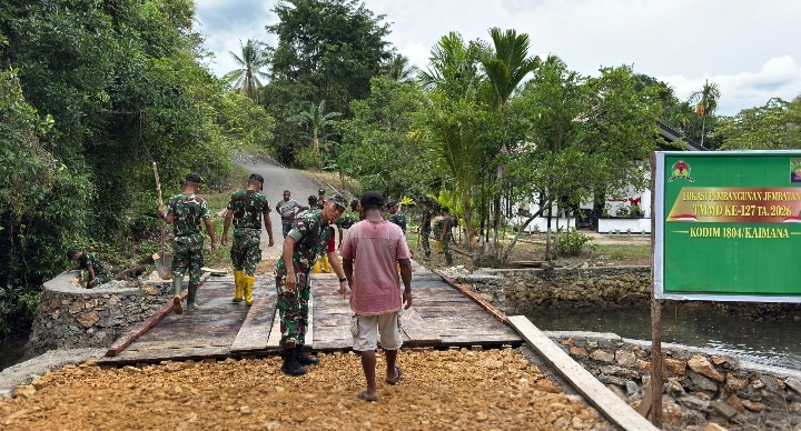 KAIMANA PB, BUSERJATIM.COM GROUP – Program TNI Manunggal Membangun Desa (TMMD) ke-127 yang dilaksanakan oleh Kodim 1804/Kaimana, Kodam XVIII/Kasuari terus menunjukkan perkembangan yang signifikan. Pada Kamis, 5 Maret 2026, Komandan Kodim 1804/Kaimana, Letkol Kav Sulistyo Nugroho, S.IP., M.IP., turun langsung ke lokasi pembangunan jembatan yang berada di Kampung Marsi, Distrik Kaimana, Kabupaten Kaimana untuk memastikan proses pengerjaan berjalan sesuai rencana dan target yang telah ditetapkan.
