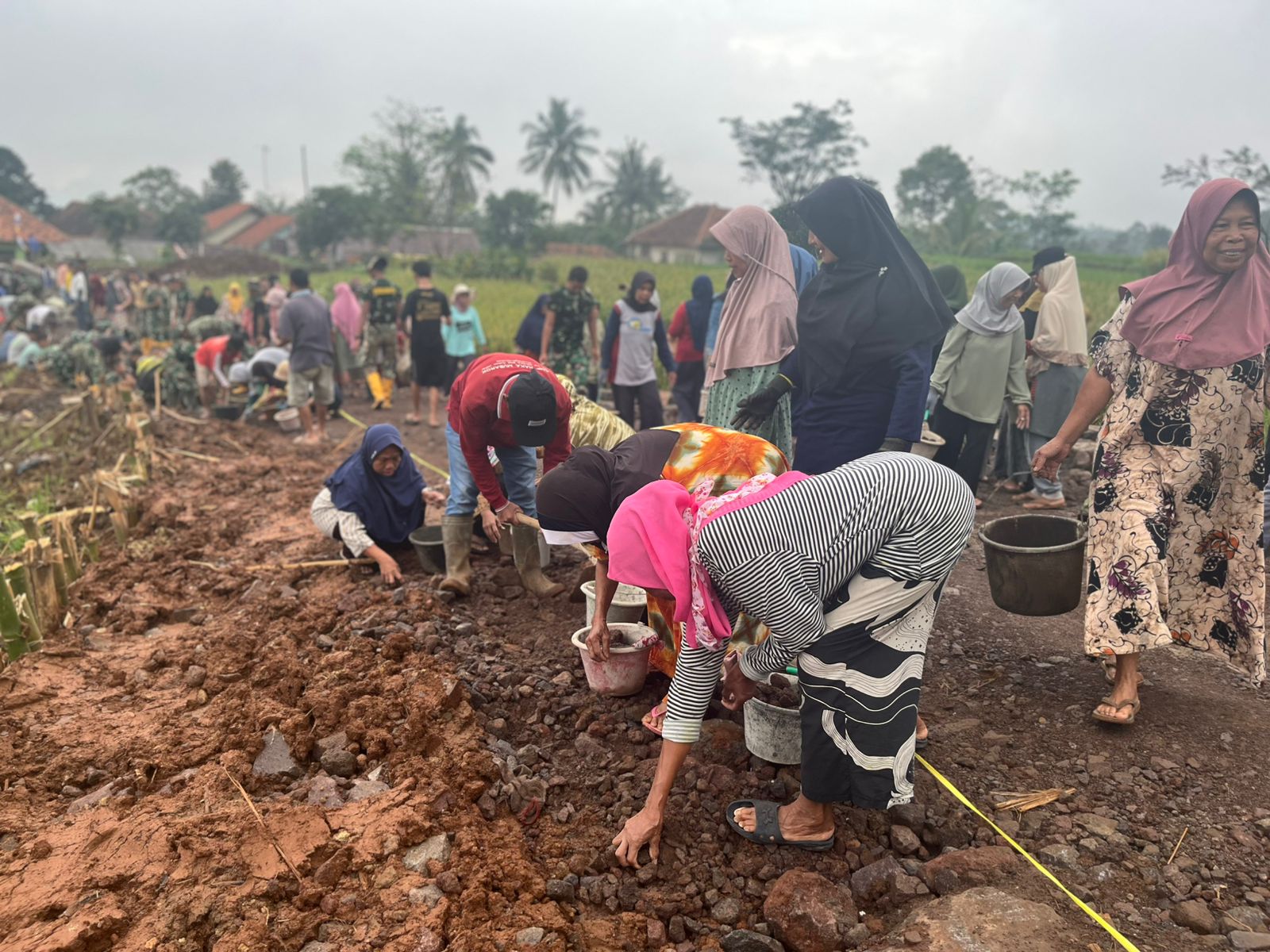 Majalengka – Pemandangan menarik terlihat dalam pelaksanaan program TNI Manunggal Membangun Desa (TMMD) ke-127 Kodim 0617/Majalengka di Desa Sindangwangi, Kecamatan Sindangwangi, Kabupaten Majalengka, Jumat (6/3/2026). Tak hanya Satgas TMMD dan warga pria, sejumlah emak-emak pun turun langsung ke jalan membantu proses pengerasan jalan.