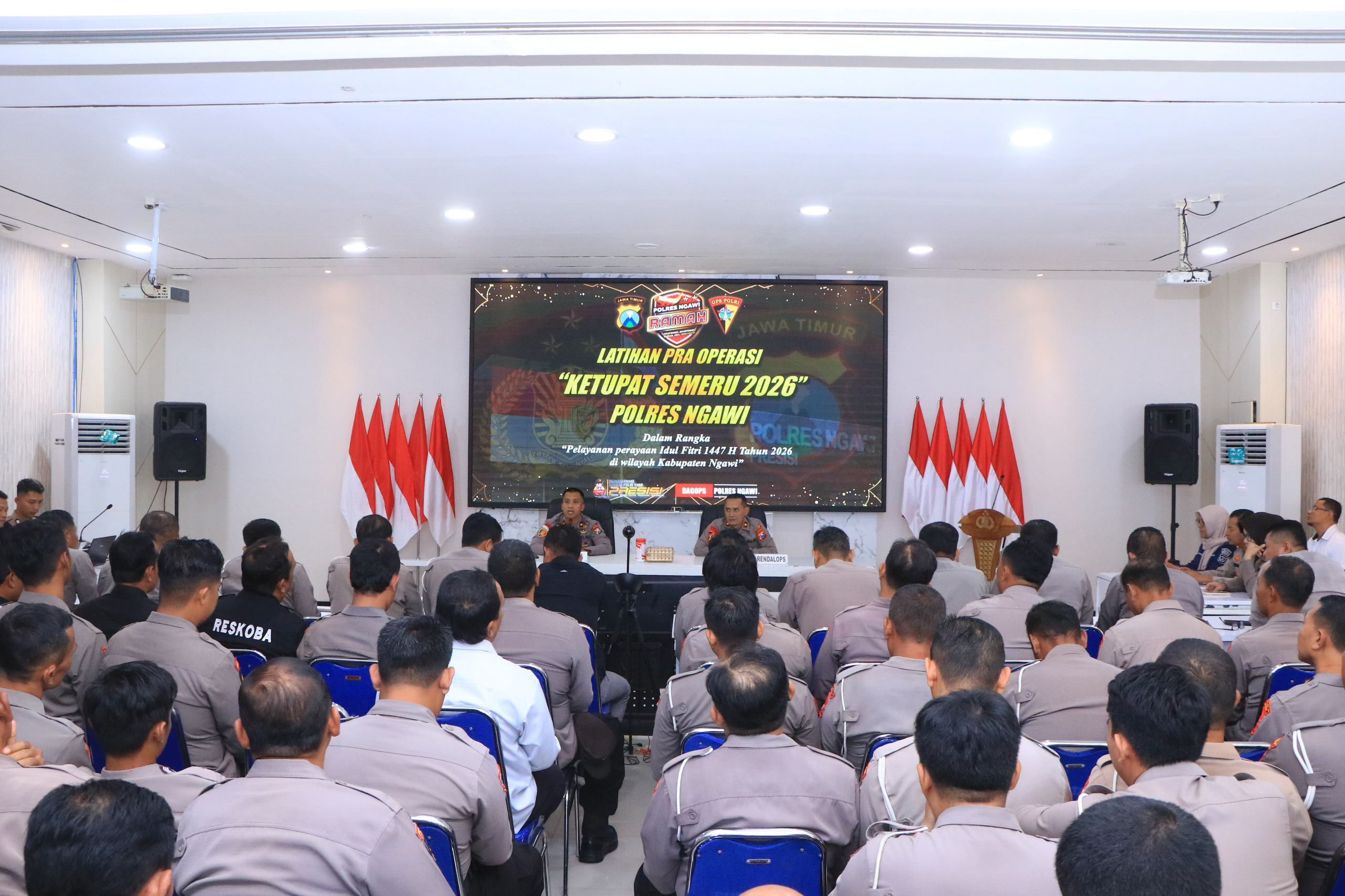 Ngawi – Polres Ngawi Polda Jatim menggelar Latihan Pra Operasi (Latpraops) Ketupat Semeru 2026 di ruang guyup Polres Ngawi, pada Kamis (12/3/2026), sebagai persiapan pengamanan arus mudik dan perayaan Idul Fitri 1447 H di wilayah Kabupaten Ngawi.
