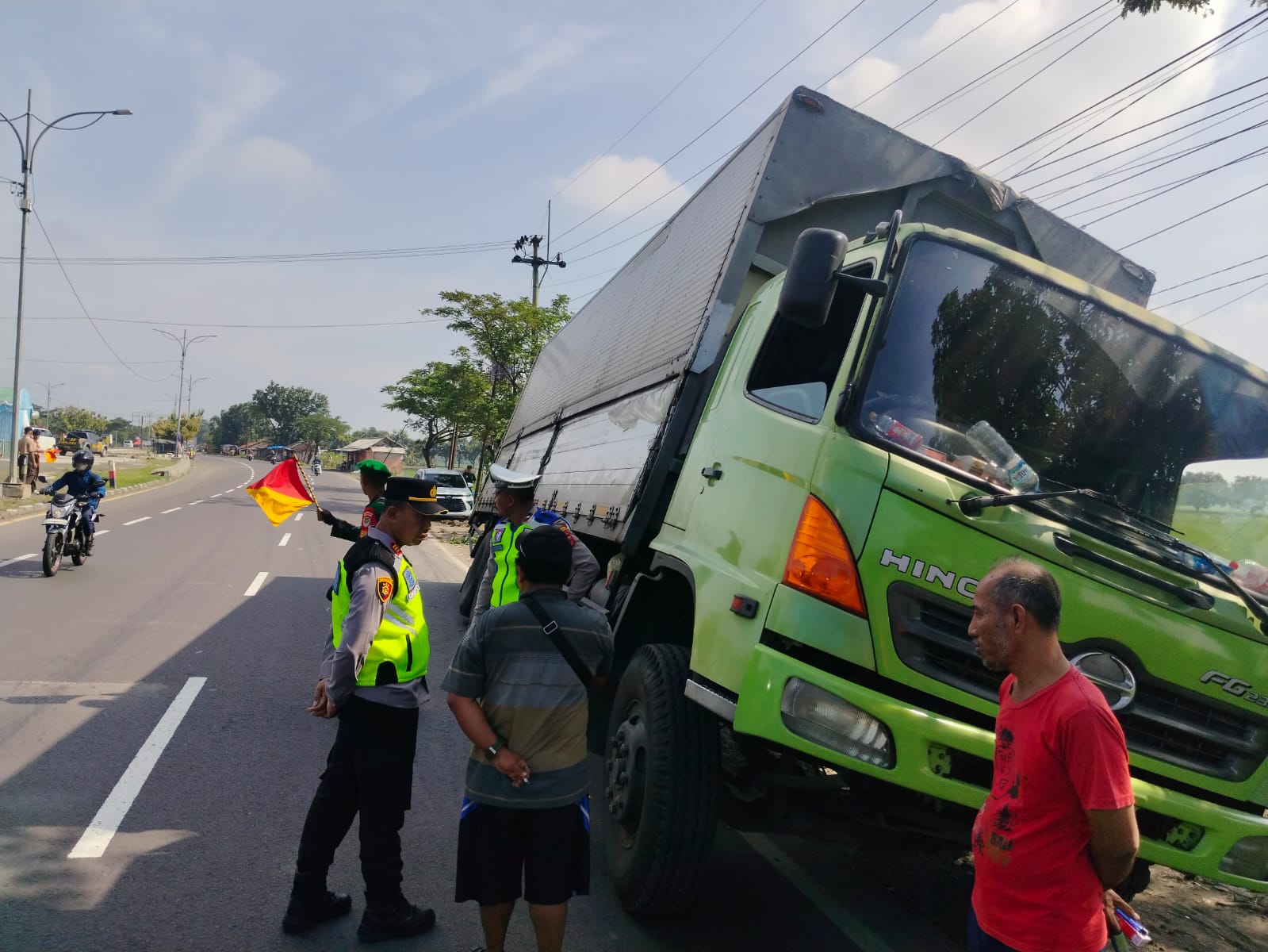 INDRAMAYU – Personel Pos Pam Bundaran Cadangpinggan Polres Indramayu Polda Jabar bergerak cepat menangani adanya kendaraan besar jenis wing box yang mengalami amblas di bahu jalan Pantura Desa Cadangpinggan, Senin (16/03/2026).