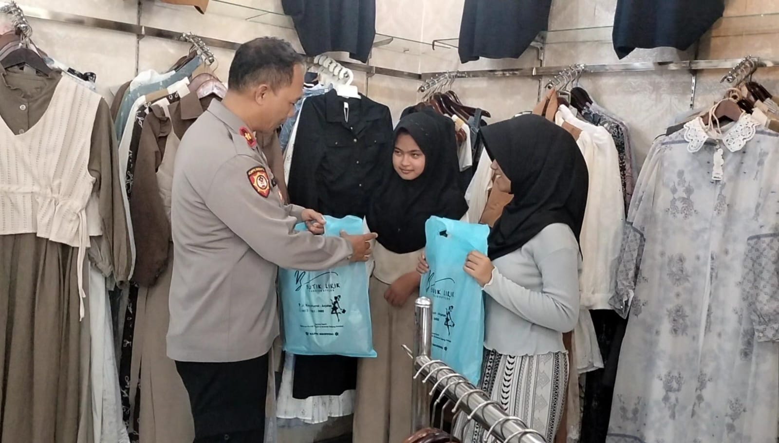 Dalam aksi simpatik tersebut, Kapolsek mengajak dua anak yatim piatu, yakni Ratna (14) dan Inggit (14) dari Desa Limpas, untuk memilih langsung baju muslim baru yang akan mereka gunakan pada perayaan Idul Fitri mendatang.