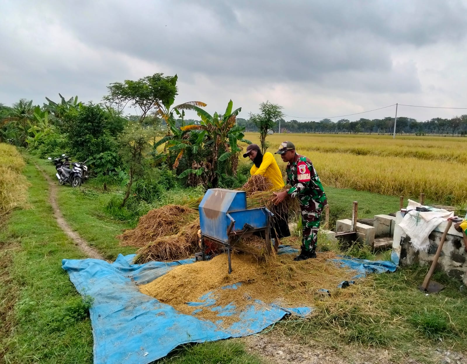 Seperti yang dilakukan Sertu Budiono anggota Koramil Tipe B 0802 / 16 Jetis, Kodim 0802/Ponorogo yang hari ini membantu petani di desa binaan yang sedang memanen padi di lahan seluas lebih kurang 0,14 kotak. ” Alhamdulillah hari ini bersama dan membantu Bapak Tata salah satu petani yang tergabung dalam Poktan Tani Makmur Desa Mojorejo yang sedang memanen padi di lahan seluas 0,14 kotak, ” ujarnya.