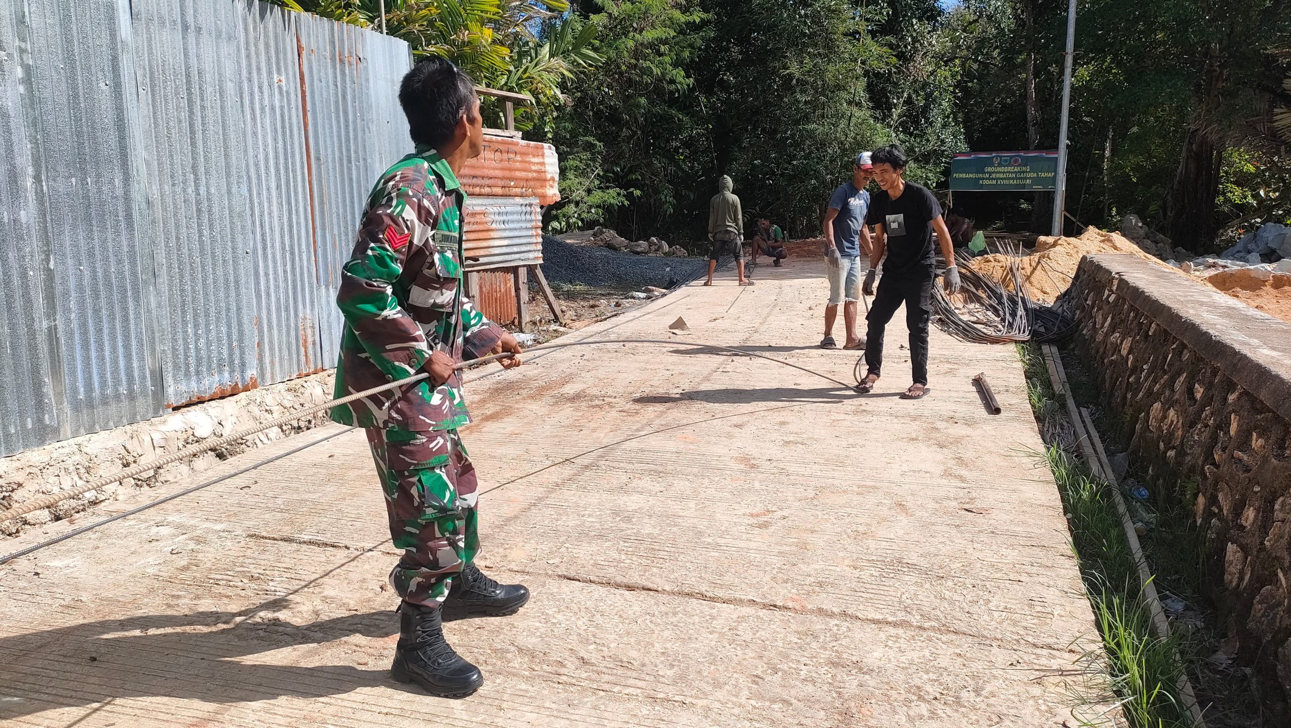 SORONG PBD, BUSERJATIM.COM GROUP – Program Presiden Republik Indonesia melalui pembangunan Jembatan Perintis Garuda Tahap IV tahun 2026 terus menunjukkan progres positif di wilayah Kodim 1802/Sorong, Korem 181/PVT, Kodam XVIII/Kasuari. Pembangunan yang berlokasi di Kampung Klatifi, Distrik Sorong Barat, Kota Sorong, Papua Barat Daya ini menjadi salah satu upaya strategis dalam meningkatkan konektivitas antarwilayah serta mendukung aktivitas masyarakat setempat. Rabu (22/04/2026)